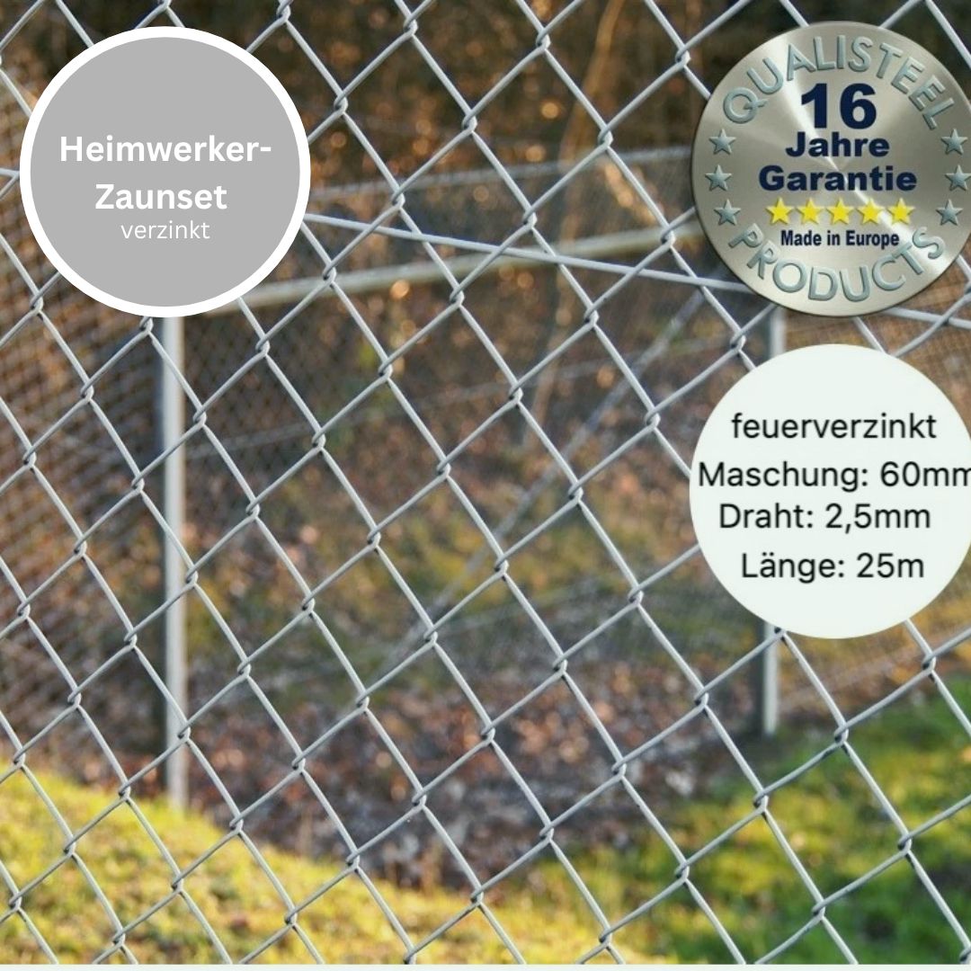 Die Maschendrahtzaun Heimwerker-Zaunsets beinhalten neben der gewählten Maschendrahtrolle aus verzinktem Draht in der Maschung 60x60mm und einer Drahtstärke von 2,5mm natürlich auch die richtige Menge an Zaunpfosten und 2 Zaunstreben. Ebenso enthalten ist das auf das Set angepasste Zubehör wie Spanndraht, Bindedraht, Drahtspanner, Geflechtspannstäbe und Schellen für Geflechtspannstäbe. Alles natürlich verzinkt und aufeinander abgestimmt.